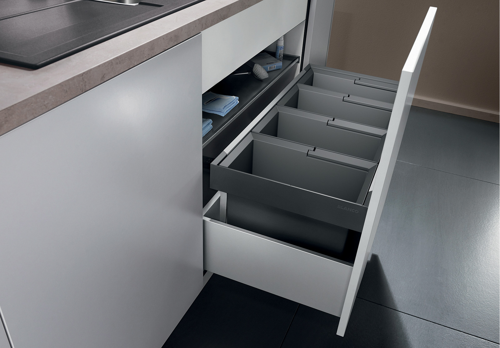 Система сортировки отходов FLEXON II Low 90/4 от Blanco воплощает философию бескомпромиссного качества, инновационного дизайна и функциональности, превращая самое активное место на кухне в продуманный, эргономичный и эстетичный центр для приготовления пищи.