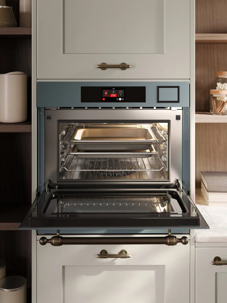 Многофункциональный компактный электрический духовой шкаф с функциями пароварки и микроволновой печи.