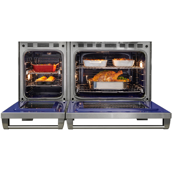 Цветной сенсорный экран интуитивно понятен и удобен. По окончании работы он незаметно скрывается на лицевой панели. Ручки управления со светодиодной подсветкой загораются при использовании, указывая, какие горелки активны. Духовки оснащены функциями самоочистки (пиролиза), отложенного старта, готовки по расписанию и опцию «Шаббат». Внутри они покрыты синим фарфором, устойчивым к температурному и механическому воздействиям, массивные дверцы легко и плавно открываются благодаря гидравлическому механизму. Благодаря выверенному дизайну, кухонный блок выглядит презентабельно и стильно.